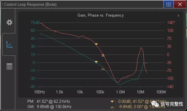 例如像圖5那樣以一個(gè)固定的低注入電壓運(yùn)行整個(gè)掃頻范圍的測試來確定大概的0dB穿越頻率。在這個(gè)例子中我們知道0dB穿越頻率是62KHz左右,然后運(yùn)行62KHz單個(gè)頻率點(diǎn)的測試并且逐漸升高注入電壓直到觀察到信號失真。一旦決定了0dB穿越頻率附近的[敏感詞]注入電壓,就可以簡單地在所有頻段內(nèi)使用注入電壓。就可以在不同的頻率點(diǎn)進(jìn)行更多的單頻率點(diǎn)測試以優(yōu)化低頻或者高頻時(shí)的注入電壓幅度。
