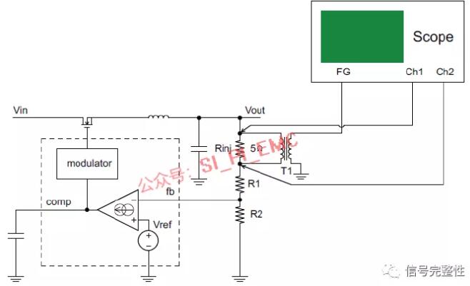 圖 1:環(huán)路響應(yīng)測試時(shí)電源閉環(huán)反饋網(wǎng)絡(luò)和示波器連接設(shè)置