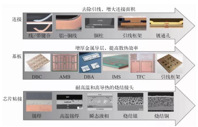 芯片粘接、連接和基板等關(guān)鍵封裝材料與技術(shù)的發(fā)展趨勢如圖2所示。連接技術(shù)從鍵合引線向帶狀、銅柱、引線框架和電鍍通孔等方向發(fā)展,通過去除引線、增大連接面積來提高導(dǎo)熱和導(dǎo)電性能。芯片粘接材料從傳統(tǒng)錫焊向金基高溫釬焊、瞬態(tài)液相連接、燒結(jié)銀和燒結(jié)銅等方向發(fā)展,大幅提高導(dǎo)熱和導(dǎo)電性能,滿足高溫可靠應(yīng)用?;逑蛑龊裉沾苫宓慕饘賹?dǎo)電導(dǎo)熱層發(fā)展,從而提高散熱效率[5]。