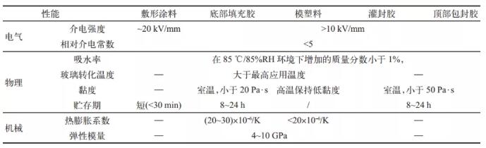 塑封材料的主要功能是電氣絕緣和環(huán)境隔離,起到防潮、防鹽霧、防霉、防塵、防碰撞和防振等防護作用,避免遭受環(huán)境的腐蝕與破壞,從而保證電子組件的電氣性能,甚至提高高壓功率模塊的電壓等級,避免電極放電,最終提高電子產(chǎn)品的可靠性[14]。塑封材料的種類和性能如表3所示,塑封材料可分為敷形涂料(Conformal Coatings)、底部填充膠(Underfills)、模塑料(Molding Compounds)、灌封膠(Potting Compounds)和頂部包封膠(Glob Tops)[14]。