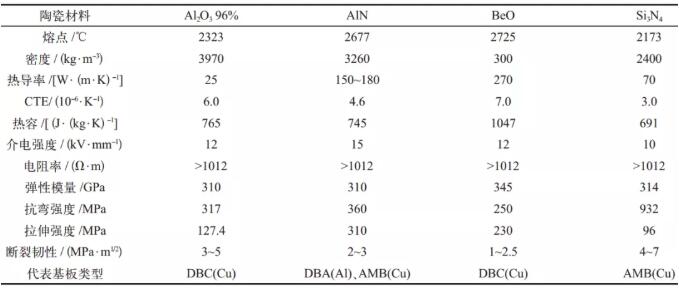 綜合考慮熱導(dǎo)率和CTE等,Al2O3、Si3N4、AlN和BeO是基板中最常用的陶瓷材料,其性能比較見表4[8,16]。BeO具有[敏感詞]的熱導(dǎo)率,但是制備過程中的微塵對人體有害,導(dǎo)致其應(yīng)用受到很大限制。Al2O3是最經(jīng)濟的選擇,但是機械強度適中,導(dǎo)熱性能相對較差。AlN的熱導(dǎo)率比Al2O3更高,CTE與芯片更匹配。Si3N4具有更高的溫度循環(huán)可靠性,但成本相對較高[17]。相對而言,Al-AlN和Cu-Si3N4的組合可靠性更高,其原因是前者鋁材料較軟,彈性模量較低,容易變形,可以減緩熱應(yīng)力對陶瓷造成的損傷;后者Si3N4的抗彎強度和斷裂韌性較大,可以抵抗銅帶來的熱應(yīng)力。