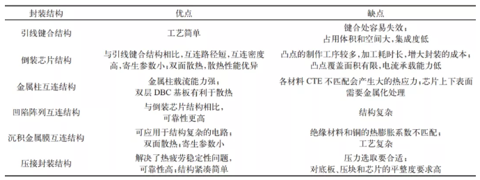 根據(jù)芯片組裝方式和互連工藝的不同,功率電子封裝結(jié)構(gòu)可分為焊接式封裝和壓接式封裝兩種形式。封裝結(jié)構(gòu)的發(fā)展趨勢如圖4所示,其中焊接式封裝可以采用引線鍵合、倒裝芯片(BGA互連)、金屬柱互連、凹陷陣列互連、沉積金屬膜互連等結(jié)構(gòu)。壓接式封裝是借助外界機械壓力形成互連結(jié)構(gòu)。為了便于對比分析,將上述幾種封裝方式的優(yōu)缺點列于表6[18]。引線鍵合具有技術(shù)成熟、成本低、布線靈活等優(yōu)點。然而,引線鍵合的模塊具有較高的寄生電感,只能從底板單面散熱[18]。并且,由于鍵合引線和芯片的CTE不匹配,產(chǎn)生較大的熱-機械應(yīng)力,使得焊點易疲勞失效,成為模塊在功率循環(huán)過程中最主要的失效形式。