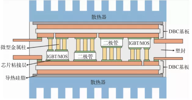 雙面連接結(jié)構(gòu)是將芯片分別與上、下基板連接,例如西門康公司提出的SKiN功率模塊[20]、富士電機提出的銅針互連SiC功率模塊[21]等,可以達到去除鍵合引線的目的。雙面連接封裝結(jié)構(gòu)主要有兩個優(yōu)點:(1)消除發(fā)射極表面的引線鍵合,有效降低寄生電感,減小電壓過沖和功率損耗,提高開關(guān)性能;(2)實現(xiàn)芯片上下兩個方向散熱,提高散熱效率,有效降低芯片結(jié)溫,從而減緩失效。美國橡樹嶺國家實驗室提出了一種雙面連接DBC基板封裝的Si IGBT或SiC MOSFET功率模塊,相比于傳統(tǒng)的引線鍵合模塊,其電感降低62%,開關(guān)損耗降低50%~90%,散熱效率提高40%~50%[22]。