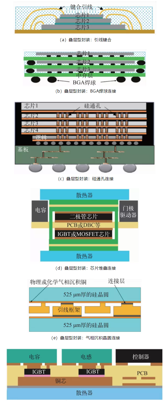 目前功率電子封裝結(jié)構(gòu)逐漸從傳統(tǒng)的引線鍵合標準封裝結(jié)構(gòu)向二次注塑(Overmold)、雙面連接(Double-Side Bonding)、器件集成(Component Integration)、三維功率集成封裝結(jié)構(gòu)(3D Power Integration)發(fā)展。通過去除引線,可以降低電磁干擾、提高散熱效率、增大集成度。其中,注塑結(jié)構(gòu)為緊湊型平面封裝,易于批量模塊生產(chǎn);雙面連接結(jié)構(gòu)可以實現(xiàn)雙面散熱,提高散熱效率;器件集成結(jié)構(gòu)可以將多種功能集成在模塊內(nèi)部,提高開關(guān)速度;三維功率集成結(jié)構(gòu)是將芯片在垂直方向上堆疊連接,可大幅降低寄生電感,提升開關(guān)性能[5]。相比于二維封裝,三維封裝具有顯著的優(yōu)點,如可以在垂直方向上大大縮短回路距離,降低寄生電感和電磁干擾,提高傳輸速度,提高開關(guān)性能,降低功率損耗;可以集成多種芯片和器件,如門極驅(qū)動電路、去耦電容、散熱器等,進一步提高功率集成密度,縮小封裝體積。但是,三維封裝目前也面臨一些挑戰(zhàn),如芯片疊層互連帶來的熱管理、生產(chǎn)工藝和良率等問題,制程工藝有待進一步完善[6,19]。