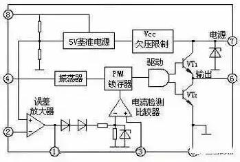 ③腳為電流傳感端,通常在功率管的源極或發(fā)射極串入一小阻值取樣電阻,將流過開關(guān)管的電流轉(zhuǎn)為電壓,并將此電壓引入境腳。當負載短路或其它原因引起功率管電流增加,并使取樣電阻上的電壓超過1V時,⑥腳就停止脈沖輸出,這樣就可以有效的保護功率管不受損壞。