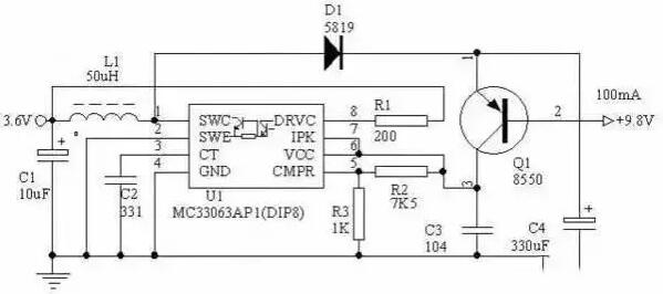 2、用MC34063做3.6V電轉(zhuǎn)9V電路圖