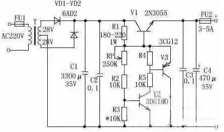 元器件選擇:變壓器T選用80W~100W,輸入AC220V,輸出雙繞組AC28V。FU1選用1A,F(xiàn)U2選用3A~5A。VD1、VD2選用 6A02。RP選用1W左右普通電位器,阻值為250K~330K,C1選用3300µF/35V電解電容,C2、C3選用0.1µF獨石電容,C4選用 470µF/35V電解電容。R1選用180~220Ω/0.1W~1W,R2、R4、R5選用10KΩ、1/8W。V1選用2N3055,V2選用 3DG180或2SC3953,V3選用3CG12或3CG80。