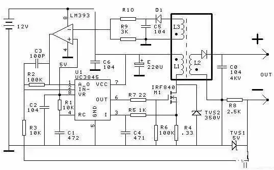 研制儀器需要一個能在0到3兆歐姆電阻上產(chǎn)生1MA電流的恒流源,用UC3845結(jié)合12V蓄電池設(shè)計了一個,變壓器采用彩色電視機高壓包,其中L1用漆包線在原高壓包磁心上繞24匝,L3借助原來高壓包的一個線圈,L2借助高壓包的高壓部分。L3和LM393構(gòu)成限壓電路,限制輸出電壓過高,調(diào)節(jié)R10 可以調(diào)節(jié)開路輸出電壓。