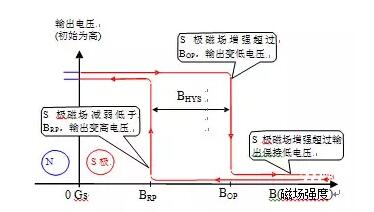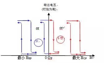 鎖定型霍爾IC:必須S極和N極交替作用于霍爾IC。如圖2,大多數(shù)鎖存型霍爾IC,當(dāng) S極面向標(biāo)記面,且施加的磁感應(yīng)強(qiáng)度超過工作點(diǎn)(BOP)(即B>BOP>0)時(shí),輸出導(dǎo)通, 輸出由高變低。當(dāng)磁感應(yīng)強(qiáng)度減弱直至撤除(B=0),輸出保持導(dǎo)通。當(dāng)N極面向標(biāo)記面,且施加的磁感應(yīng)強(qiáng)度超過釋放點(diǎn)(BRP)(即B<BRP<0)時(shí),輸出關(guān)斷, 輸出由低變高。鎖定型霍爾IC上電過程中,如果外部磁場處于BOP和BRP之間,輸出初始狀態(tài)將不確定。