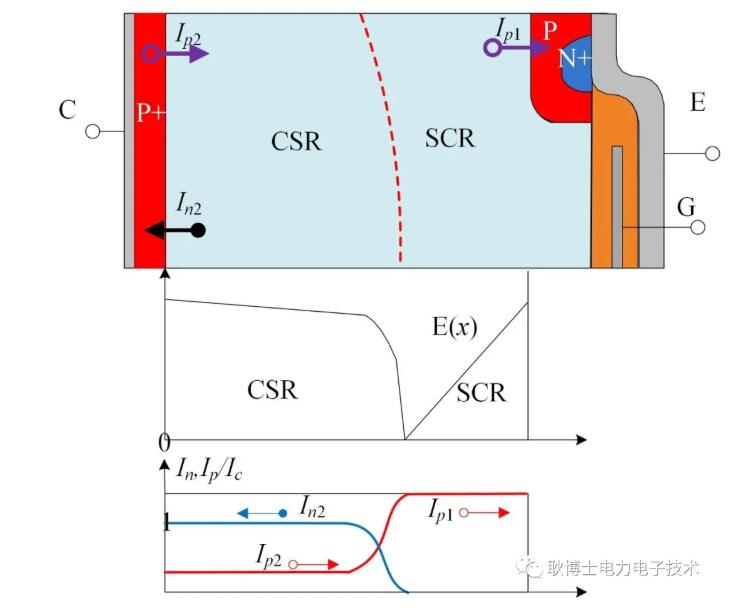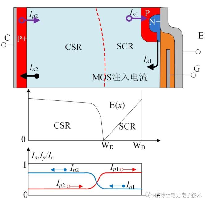IGBT關(guān)斷過程中該區(qū)域承載電壓,SCR區(qū)域內(nèi)電子電流逐漸減小,而空穴電流逐漸增大。