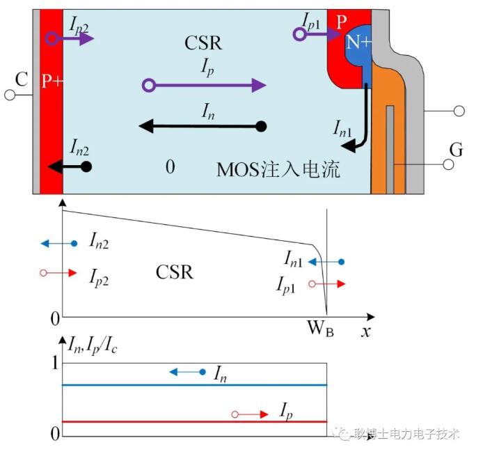 IGBT屬于雙極性器件,即電子和空穴均參與導(dǎo)電。假設(shè)流過MOS的電子電流為In,流過pnp晶體管的空穴電流為Ip,那么流過