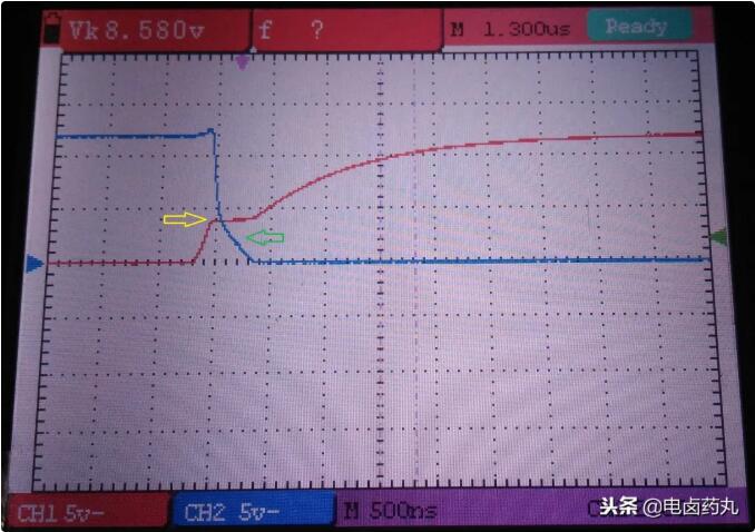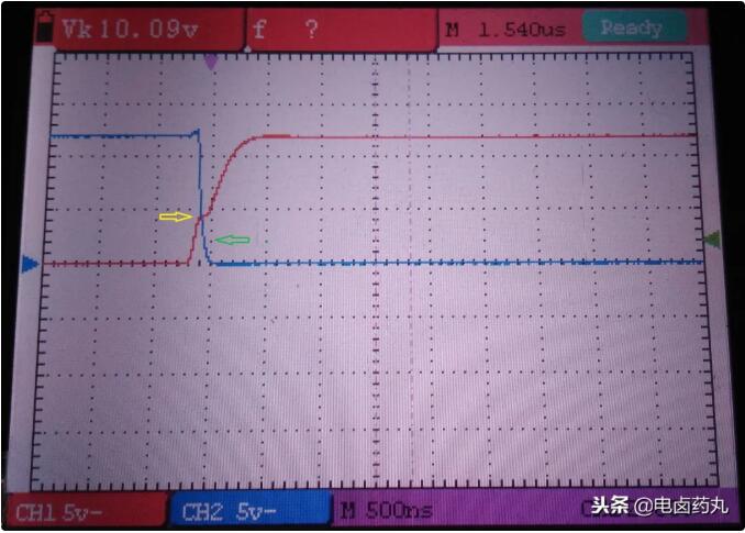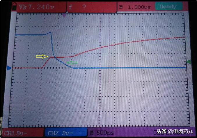 如圖4為G極電阻為10Ω時MOS管開通的波形,紅色代表Vgs的電壓波形,藍(lán)色代表Vds的電壓波形。平臺電壓的寬度很窄([敏感詞]箭頭),在平臺電壓下DS極間是變阻區(qū),Vds很窄(綠色箭頭)。