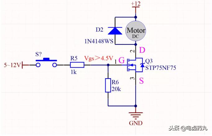 ①參與普通的邏輯控制,和三極管一樣作為開關(guān)管使用,電流可達(dá)數(shù)安培,如圖1為MOS管驅(qū)動直流電機電路。R6下拉電阻是必須的(取值一般10--20k),原理和NPN三極管下拉電阻一樣。