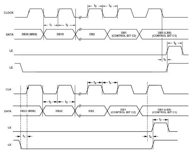 控制接口由時鐘 CLOCK,數(shù)據(jù) DATA,加載使能 LE 構(gòu)成。加載使能 LE 的下降沿提供起始串行數(shù)據(jù)的同步。串行數(shù)據(jù)先移位到 PLL 頻率合成器的移位寄存器中,然后在 LE 的上升沿更新內(nèi)部相應(yīng)寄存器。注意到時序圖中有兩種 LE 的控制方法。