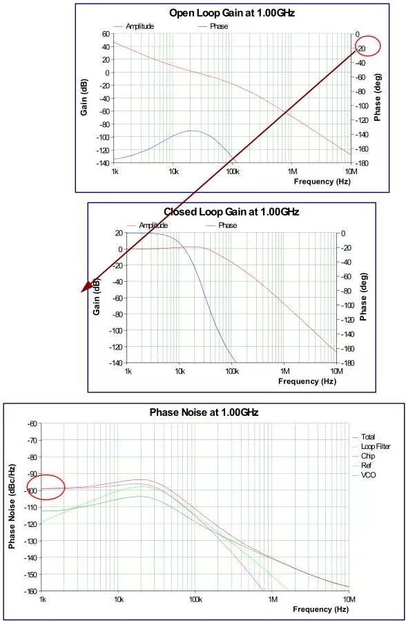 濾波器開環(huán)增益和閉環(huán)增益以及相位噪聲圖之間的關(guān)系。閉環(huán)增益的轉(zhuǎn)折頻率就是環(huán)路帶寬。相位噪聲圖上,該點對應(yīng)于相位噪聲曲線的轉(zhuǎn)折頻率。如果設(shè)計的鎖相環(huán)噪聲太大,就會出現(xiàn)頻譜分析儀上看到的轉(zhuǎn)折頻率大于所設(shè)定的環(huán)路帶寬。