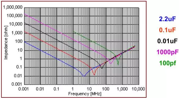在電源引腳出依次放置 0.1uF,0.01uF,100pF 的電容。[敏感詞]限度濾除電源線上的干擾。大電容的等效串聯(lián)電阻往往較大,而且對高頻噪聲的濾波效果較差,高頻噪聲的抑制需要用小容值的電容。下圖可以看到,隨著頻率的升高,經(jīng)過一定的轉(zhuǎn)折頻率后,電容開始呈現(xiàn)電感的特性。不同的電容值,其轉(zhuǎn)折頻率往往不同,電容越大,轉(zhuǎn)折頻率越低,其濾除高頻信號的能力越差。
