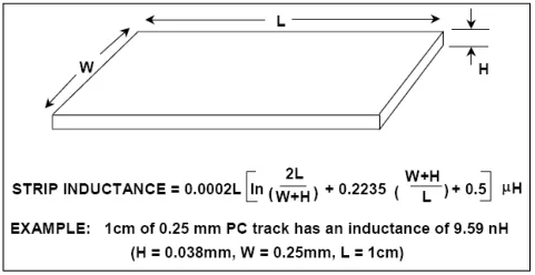 電感的選取,[敏感詞]選用高 Q 值的。Coilcraft 公司是不錯的選擇。市面上常見的電感基本在 1nH以上。更小的電感可以用 PCB 導(dǎo)線制作。這里給出一個計算 PCB 引線電感的簡單公式,如下圖所示。