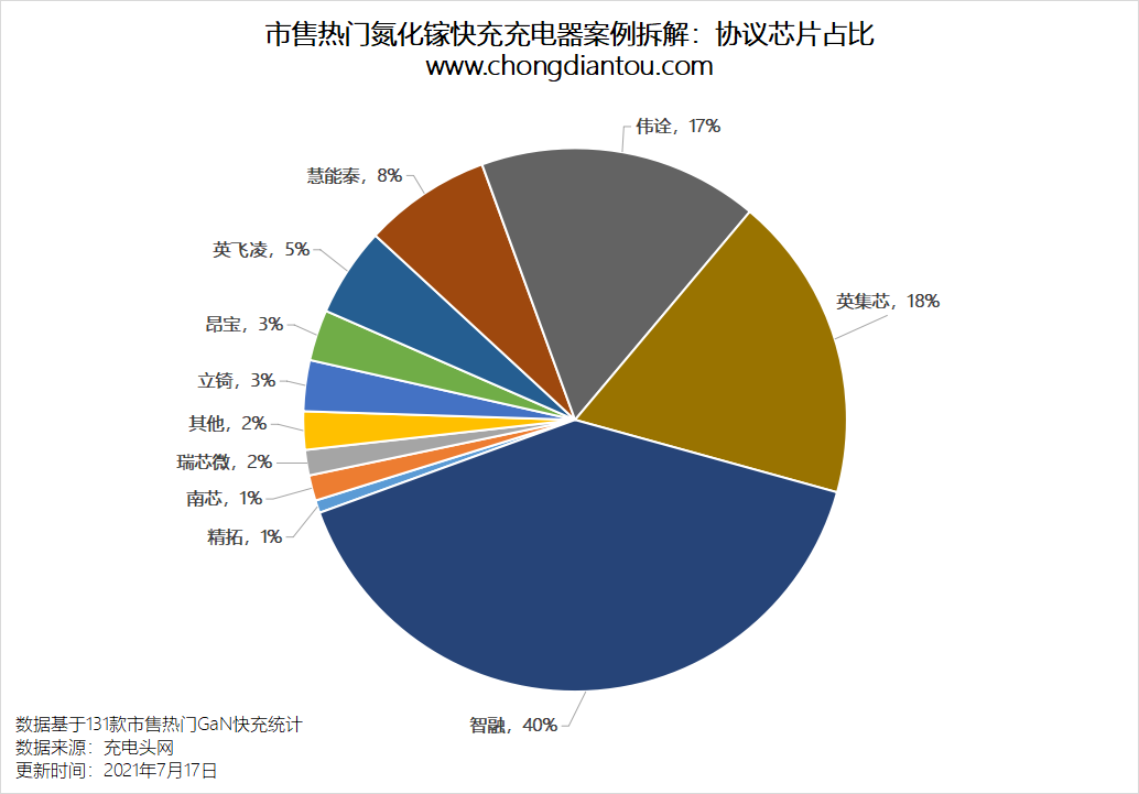 協(xié)議芯片方面就出現(xiàn)了一個很有意思的現(xiàn)象,國產(chǎn)廠商占據(jù)了70%以上的市場份額,其中智融科技憑借40%的占比坐上了頭把交椅,這也主要得益于市面對多口氮化鎵快充產(chǎn)品的需求十分旺盛,智融SW351x系列借此機會一炮而紅。