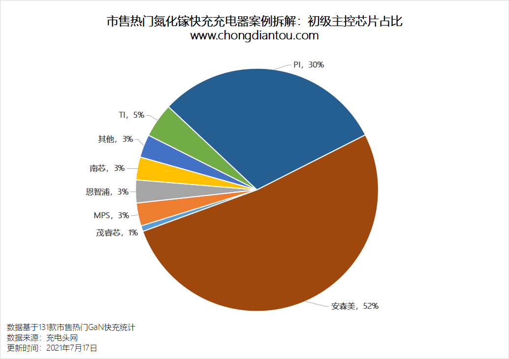 從主控芯片的分布來看,安森美目前處于市場的主導(dǎo)地位,占比達到了52%,這主要是歸功于NCP1342這顆經(jīng)典的QR反激拓撲主控芯片,這顆芯片也是很多氮化鎵器件廠商、方案商開發(fā)Demo時最常用的一顆料。