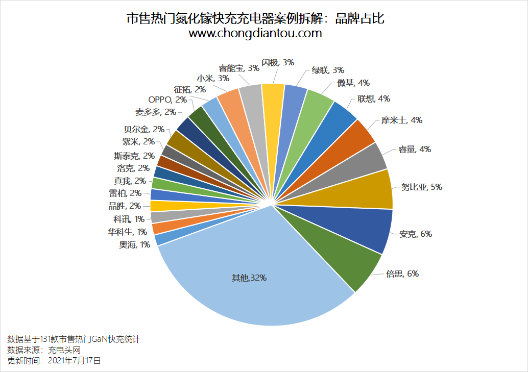 在本次匯總的這131款氮化鎵快充產(chǎn)品拆解案例,分別來自65家不同的品牌,其中,努比亞、倍思、ANKER三家品牌推出的氮化鎵快充產(chǎn)品占比相對較高,已有7-8款案例。此外,摩米士、聯(lián)想、小米、傲基、閃極、睿能寶等品牌的案例約為4-5款,占比約在3%-4%之間。另有32%占比的品牌,其產(chǎn)品案例均為1款。