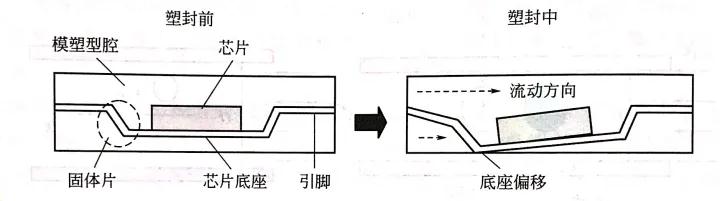 如圖所示為塑封料導致的底座偏移,此時,上下層模塑腔體內(nèi)不均勻的塑封料流動會導致底座偏移。