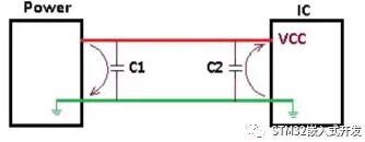 如果Power受到了干擾,一般是頻率比較高的干擾信號(hào),可能使IC不能正常工作。在靠近Power處并聯(lián)一個(gè)電容C1,因?yàn)殡娙輰?duì)直流開路,對(duì)交流呈低阻態(tài)。頻率較高的干擾信號(hào)通過C1回流到地,本來會(huì)經(jīng)過IC的干擾信號(hào)通過電容抄近路流到了GND。這里的C1就是旁路電容的作用。