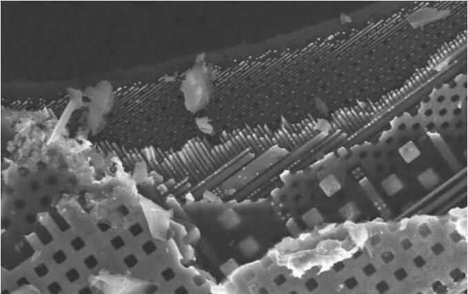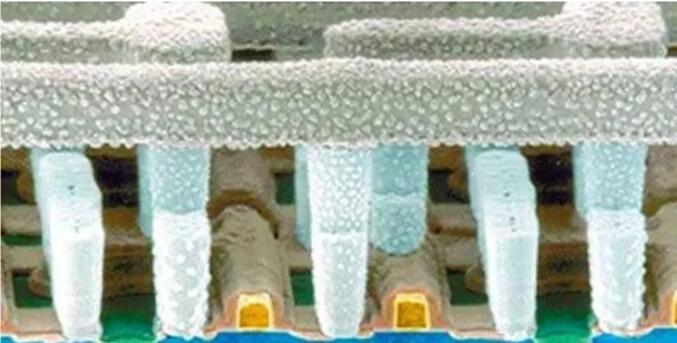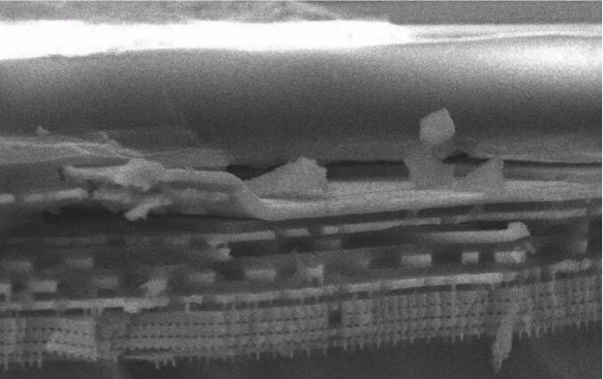 這是CPU的截面視圖,可以清晰的看到層狀的CPU結(jié)構(gòu),芯片內(nèi)部采用的是層級排列方式,這個CPU大概是有10層。其中最下層為器件層,即是MOSFET晶體管。