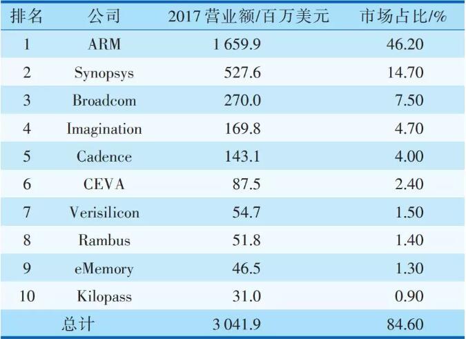 集成電路產(chǎn)業(yè)的最上游是設(shè)計(jì)IP,2018年全球IP市場規(guī)模約49億美元。IP本身的產(chǎn)值雖然不是[敏感詞]但是其具有極大的附加值和特有的產(chǎn)業(yè)生態(tài)支柱作用 ,同時(shí)其產(chǎn)品與國家信息安全密切相關(guān)。以IP核復(fù)用為基礎(chǔ)的SoC技術(shù)是全球集成電路發(fā)展的方向。產(chǎn)業(yè)界以IP核設(shè)計(jì)為主的SoC占總數(shù)的90%以上。全球的10大設(shè)計(jì)IP的供應(yīng)商如表1所示。