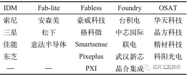 CIS封裝最初采用的是帶有玻璃蓋板的陶瓷封裝,例如Amkor的VisionPak就是一種陶瓷無鉛芯片載體。這種方案比較昂貴而且會(huì)占用很大的相機(jī)內(nèi)空間。20世紀(jì)末晶圓級(jí)封裝(Wafer Level Package, WLP)技術(shù)逐步發(fā)展起來,其優(yōu)勢(shì)在于尺寸小、重量輕和成本低,并逐漸引起大家的關(guān)注。2007年3月,日本Toshiba公司首次展出采用硅通孔技術(shù)的WLP的小型圖形傳感器模組,該技術(shù)不僅提供用于模塊集成的完全密閉的器件,使由污染顆粒所導(dǎo)致的CIS成品率損失大大降低,還具有最小尺寸和質(zhì)量、有效降低寄生效應(yīng)、改善芯片運(yùn)行速度和降低功耗等優(yōu)點(diǎn)[11-12]。如今全球只有臺(tái)積電下屬公司精材科技、華天科技(昆山)電子有限公司、晶方科技、科陽(yáng)光電四家OSAT(Outsourced Semiconductor Assembly and Testing)可以提供圖像傳感器WLP解決方案,其中只有華天科技(昆山)和晶方科技能夠提供300 mm(12英寸)圖像傳感器WLP服務(wù)。表1列舉了全球CIS各環(huán)節(jié)主要供應(yīng)商。