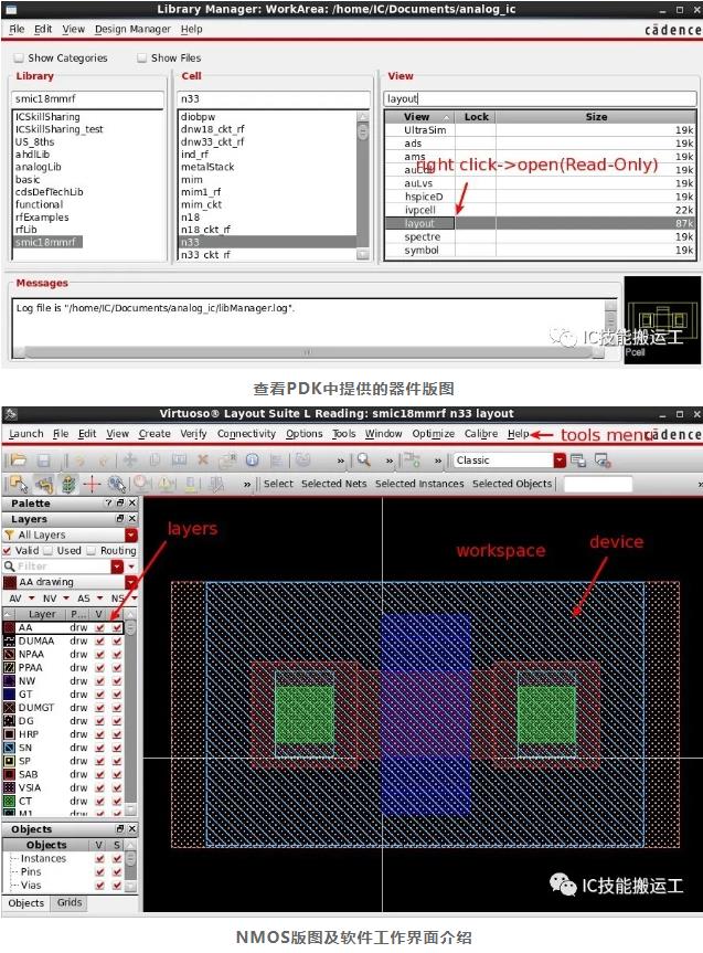 首先了解一下版圖設(shè)計(jì)工具,同時(shí)通過(guò)打開PDK中提供的器件版圖了解一下版圖設(shè)計(jì)。在軟件Library Manager窗口中找到PDK提供的庫(kù),選擇提供layout View的器件,并打開對(duì)應(yīng)的layout.