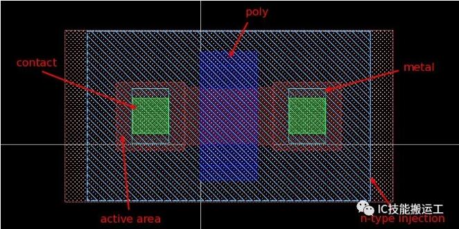 結(jié)合上面的版圖示例和本文最初給出的CMOS反相器截面圖來(lái)初步認(rèn)識(shí)一下版圖,同時(shí)熟悉一下版圖中對(duì)某些層的一些常用叫法。
