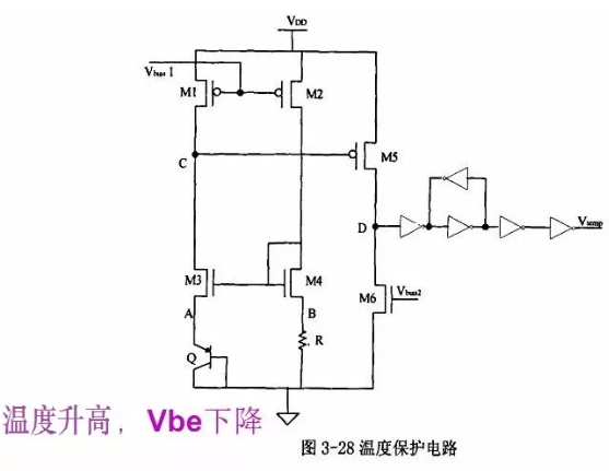 3、過溫保護模塊OTP 溫度保護是為了防止芯片異常高溫損壞,原理比較簡單,利用晶體管的溫度特性然后通過比較器設置保護點來關斷輸出。