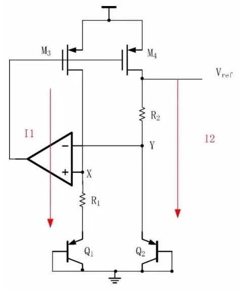 回到上圖,由運放分析VX=VY,那么就是I1*R1+Vbe1=Vbe2,這樣可得:I1=△Vbe/R1,而且因為M3和M4的柵極電壓相同,因此電流I1=I2,所以推導出公式:I1=I2=VT*ln(N/R1) N是Q1 Q2的PN結面積之比!