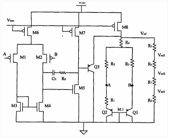 這樣我們最后得到基準Vref=I2*R2+Vbe2,關鍵點:I1是正溫度系數(shù)的,而Vbe是負溫度系數(shù)的,再通過N值調節(jié)一下,可是實現(xiàn)很好的溫度補償!得到穩(wěn)定的基準電壓。N一般業(yè)界按照8設計,要想實現(xiàn)零溫度系 數(shù),根據(jù)公式推算出Vref=Vbe2+17.2*VT,所以大概在1.2V左右的,目前在低壓領域可以實現(xiàn)小于1V的基準,而且除了溫度系數(shù)還有電源紋波抑制PSRR等問題,限于水平?jīng)]法深入了。最后的簡圖就是這樣,運放的設計當然也非常講究: