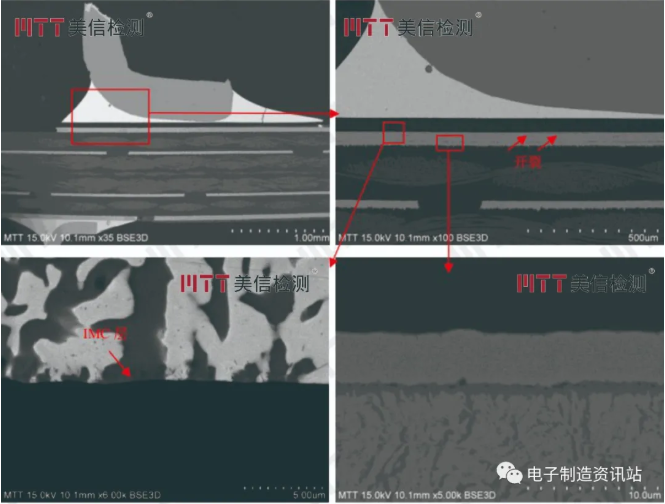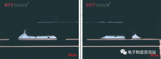 其中切片分析是將NG樣品和OK樣品分別制作切片,了解焊點界面狀態(tài),而后利用SEM+EDS對兩個樣品進行觀察分析,得出結論: