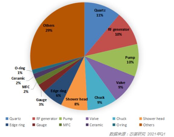 2020年,中國大陸晶圓線8吋和12吋前道設(shè)備零部件(parts)采購金額超過10億美元。如果排除三星、海力士、臺(tái)積電等境外廠商在中國大陸的產(chǎn)線,中國本土晶圓制造廠商(主要包括中芯國際、華虹集團(tuán)、華潤微電子、長江存儲(chǔ)等)采購金額(口徑統(tǒng)一為8吋和12吋前道設(shè)備零部件,后文同)約為4.3億美元。中國晶圓制造廠商采購的設(shè)備零部件主要有石英(Quartz)、射頻發(fā)生器(RF Generator)、各種泵(Pump)等,占零部件采購金額的比重達(dá)到或超過10%。此外,各種閥門(Valve)、吸盤(Chuck)、反應(yīng)腔噴淋頭(Shower Head)、邊緣環(huán)(Edge Ring)等零部件的采購占比也比較高。