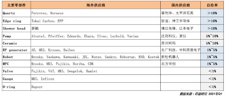 8-12吋晶圓設(shè)備部分零部件供應(yīng)商及自給率情況