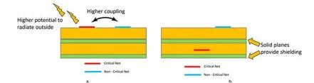 在波長較短的高速 PCB (> 100MHz) 上,任何關鍵網(wǎng)絡(見圖 4a)的電氣長度都足以使其成為有效的輻射源,尤其是當暴露在頂層或底層時。 這種不需要的輻射可以耦合到任何相鄰的走線,甚至耦合到靠近走線的器件中的線纜中。 我們建議將關鍵網(wǎng)絡埋在PCB內(nèi)層的實心平面之間,如圖 4b 所示。 這有助于封閉住來自走線的場并避免任何以串擾或EMI形式出現(xiàn)的意外耦合。 如果不得不將這些關鍵網(wǎng)絡暴露在外層,則暴露部分的長度應盡可能小。 這是因為暴露走線的長度越短,輻射的就越少,因為如果它們在電氣上很小,它們將是低效的天線。