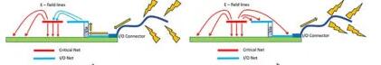 圖 3a(左)和 3b:由關鍵網(wǎng)絡和 I/O 網(wǎng)絡的接近引起的潛在 EMI/EMC 問題