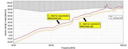 假設我們要根據(jù) EMI/EMC 法規(guī) AIS 004(在印度)或 UNECE R10(在歐洲)輻射發(fā)射要求來測試該 PCB。圖 8 顯示了在 30 MHz ? 1 GHz 頻率范圍內(nèi),距離該 PCB 1 米處的模擬遠場的比較分析。請注意,不對稱差分對的情況會使發(fā)射電平增加約 8 到 10 dB,也會導致不符合 563.50 MHz 及更高頻率的情況。