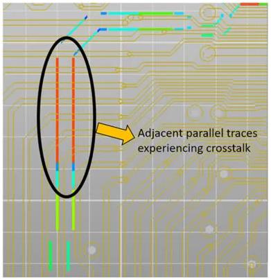 圖 1:PCB 上具有潛在串擾問題的相鄰走線的圖示。