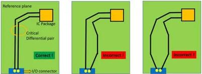 理論上,差分對傳輸大小相等但極性相反的信號,因為差分對產(chǎn)生的EMI互相抵消或可以忽略不計。 但是,這僅在線對中的走線長度相等并且盡可能對稱地彼此靠近時才有效。 違反其中任何一項都會產(chǎn)生共模噪聲和 EMI 問題。 這是一個非常值得關注的問題,特別是對于承載高頻關鍵信號的差分網(wǎng)絡,因為 EMI 會增加所承載信號的頻率。 圖5顯示了在 IC 封裝和電路板上的出口點(連接器)之間關鍵差分對的正確/不正確方法的幾個走線示例。