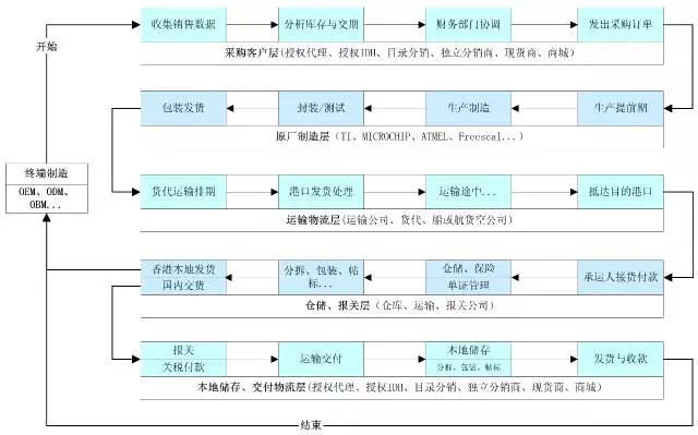 由圖二的供應(yīng)鏈價(jià)值傳遞流程所示,芯片由原廠(chǎng)制造到整機(jī)生產(chǎn)商,所經(jīng)過(guò)的基本節(jié)點(diǎn)分別有:芯片設(shè)計(jì)、設(shè)片制造、方案設(shè)計(jì)、整機(jī)設(shè)計(jì)、零配件采購(gòu)、運(yùn)輸、儲(chǔ)存、報(bào)關(guān)、金融服務(wù)和產(chǎn)業(yè)咨詢(xún)分析等。作為鏈條上的蚱蜢,我們需要把自己所處的節(jié)點(diǎn)找出來(lái),原始供應(yīng)商是誰(shuí)?代理商有哪幾家?方案設(shè)計(jì)公司有哪些?誰(shuí)在做零配件采購(gòu)?什么是趨勢(shì)產(chǎn)品?生產(chǎn)廠(chǎng)家在哪里......
