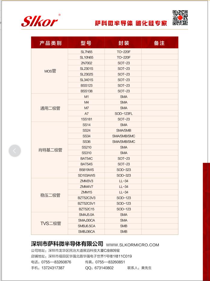 薩科微為客戶(hù)提供場(chǎng)效應(yīng)管MOS管、LDO電源管理IC、AC/DC、碳化硅mos管、IGBT、可控硅、ESD二極管、TVS二極管、hall霍爾元件、肖特基二極管、三極管等產(chǎn)品。產(chǎn)品應(yīng)用于TWS藍(lán)牙耳機(jī)、電機(jī)驅(qū)動(dòng)、PD快充、開(kāi)關(guān)電源、充電樁、電源適配器、掃地機(jī)器人、逆變器、鋰電保護(hù)等領(lǐng)域。薩科微這次在華強(qiáng)北銷(xiāo)售的,都是slkor品牌的2N7002 、BSS138 、SL10N65 等薩科微mos管,SS14、SS24、SS16、BAT54C、SD103AWS等肖特基二極管,SMAJ5.0A 、SMBJ6.5CA、SMAJ30CA等TVS二極管,1N4148W、LL4148等開(kāi)關(guān)二極管、SLPESD0402M16、SLPESD0603-24等ESD二極管、AMS1117-3.3、AMS1117-5.0、SL78L05等薩科微線性穩(wěn)壓器LDO,TL431、MC34063S、通LM2575S-5.0電源管理IC,ULN2803AS、ULN2003AU、TIP122薩科微達(dá)林頓管、S8050、SS8550、MMBT5401、MMBT5551等三極管、SL1613SH、SL1603SL霍爾開(kāi)關(guān)傳感器,BTA16-800B、BTA24-800B、BT136S-800E等型號(hào)的可控硅,LM321、LM358S薩科微的運(yùn)算放大器等通用暢銷(xiāo)的型號(hào)。