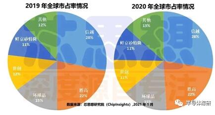 根據芯思想研究院相關數據,2020年全球前五大硅片提供商分別是:日本信越化學(Shin-Etsu),市占率27.53%;日本勝高(SUMCO),市占率21.51%;中國臺灣環(huán)球晶圓(Global Wafers),市占率14.8%;德國世創(chuàng)(Siltronic)市占率11.46%;韓國鮮京矽特?。⊿K Siltron)市占率11.31%。排名第六的是索特克(Soitec),市占率約5.7%;可喜的是,滬硅產業(yè)的排名由2019的第八位上升一位,力壓合晶科技,排名第七,市占率約2.2%。