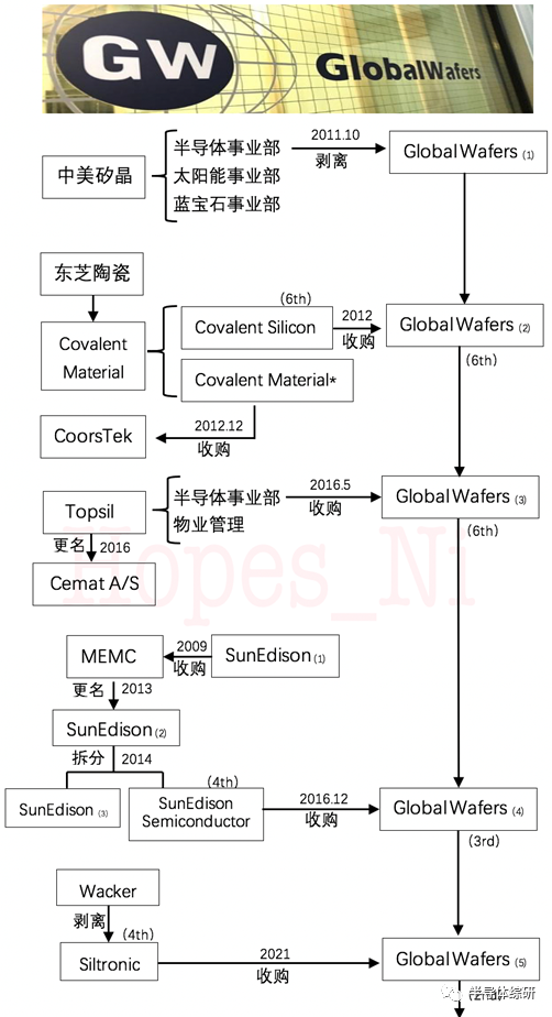 2、2012年,獨立后的環(huán)球晶圓收購了當時全球排名第六以東芝陶瓷(Toshiba Ceramics)為前身的Covalent Material的半導體晶圓業(yè)務(Covalent Silicon公司),此次收購案后,Covalent Silicon公司2013年1月更名為GlobalWafers Japan,在2012財年扭虧為盈,同時環(huán)球晶圓也成為了全球第六大的硅晶圓生產商。