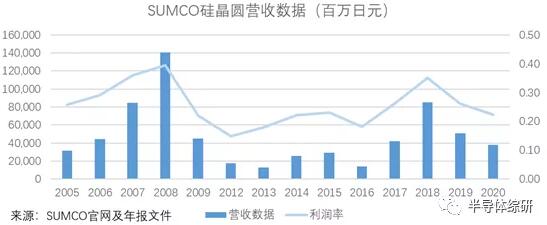 由圖可知,SUMCO公司在2006和2007的兩年里,不僅營(yíng)收數(shù)據(jù)節(jié)節(jié)攀升,利潤(rùn)率也呈現(xiàn)逐季增加的態(tài)勢(shì),經(jīng)調(diào)研得知,SUMCO很早就開(kāi)始300mm 晶圓的量產(chǎn),發(fā)展到 2006和 2007 年,在技術(shù)上已經(jīng)成熟,市場(chǎng)也正好進(jìn)入成熟期。而且由于300mm相對(duì)于 200mm 晶圓的成本優(yōu)勢(shì),使得市場(chǎng)對(duì)300mm晶圓的需求暴增,從而毛利潤(rùn)和營(yíng)收數(shù)據(jù)不停攀升,但由于受到2008年金融危機(jī)的影響,SUMCO公司的營(yíng)收數(shù)據(jù)和利潤(rùn)率出現(xiàn)驟降,出現(xiàn)虧損的情況,在2012年前后均跌到[敏感詞]值。在之后很長(zhǎng)的時(shí)間里,SUMCO公司都處在恢復(fù)階段,但從總體上看營(yíng)收數(shù)據(jù)與利潤(rùn)率的漲跌態(tài)勢(shì)基本一致。