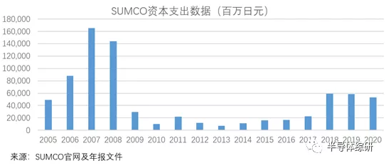 從圖中可以看出,SUMCO公司的資本支出從2005年開(kāi)始迅速增加,到了2007年SUMCO的資本支出達(dá)到[敏感詞]值,但資本支出從2008年到2009年出現(xiàn)斷崖式下跌,在之后的八年時(shí)間內(nèi),SUMCO公司的資本支出一直處于低谷狀態(tài),直到2018年才有較大幅度的恢復(fù)增長(zhǎng),2019年和2020年的數(shù)據(jù)與2018年的基本持平未有漲跌。這是由于2005前后半導(dǎo)體行業(yè)迎來(lái)了新的發(fā)展時(shí)期,對(duì)半導(dǎo)體的需求越來(lái)越大,SUMCO公司為了擴(kuò)大產(chǎn)能加大對(duì)半導(dǎo)體生產(chǎn)的投資,如增加晶圓廠的數(shù)量。但是遭遇2008年的金融危機(jī),硅晶圓市場(chǎng)再次進(jìn)入冷寂,之前為了半導(dǎo)體的生產(chǎn)擴(kuò)大產(chǎn)能便出現(xiàn)了產(chǎn)能過(guò)剩的現(xiàn)象,所以從2009年一直到2017年SUMCO公司的資本支出一直處于低谷是在消耗這部分過(guò)剩的產(chǎn)能,而到了2018年半導(dǎo)體行業(yè)出現(xiàn)好轉(zhuǎn),資本支出才有所反彈。