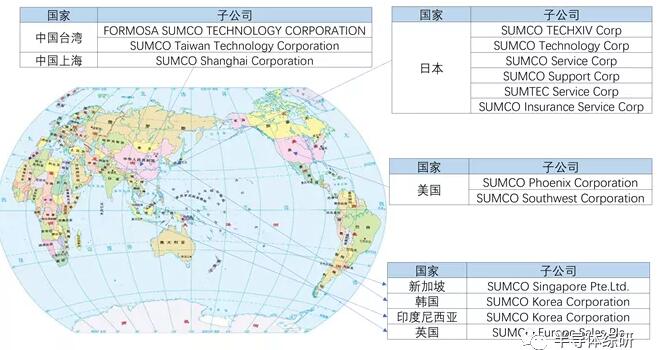 SUMCO的總公司位于日本東京,共擁有15家主要的子公司,其中6家主要日本本土子公司,9家海外主要子公司,而海外子公司主要分布在美國(guó)、中國(guó)臺(tái)灣、英國(guó)、印度尼西亞等地區(qū),而在美國(guó)和臺(tái)灣子公司分布較多。