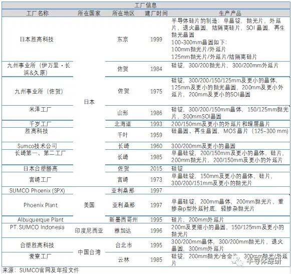 SUMCO公司根據(jù)產(chǎn)能的需求,在日本及世界其他一些地區(qū)均建有晶圓生產(chǎn)工廠,據(jù)統(tǒng)計(jì)SUMCO公司一共建有16家晶圓生產(chǎn)工廠,分別在日本、美國(guó)、中國(guó)臺(tái)灣及印度尼西亞等地區(qū),關(guān)于SUMCO各個(gè)晶圓生產(chǎn)工廠的名稱、地區(qū)、產(chǎn)品等詳細(xì)信息見(jiàn)下表。